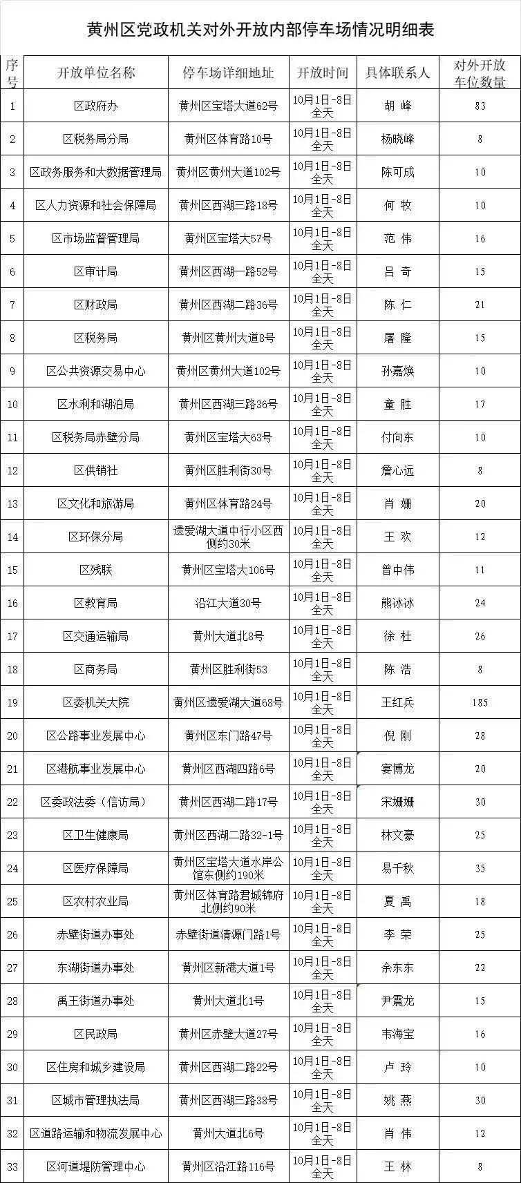 黄冈主城区33家机关企事业单位开放内部停车场,10月1日-10月8日,全天提供免费停车服务。
