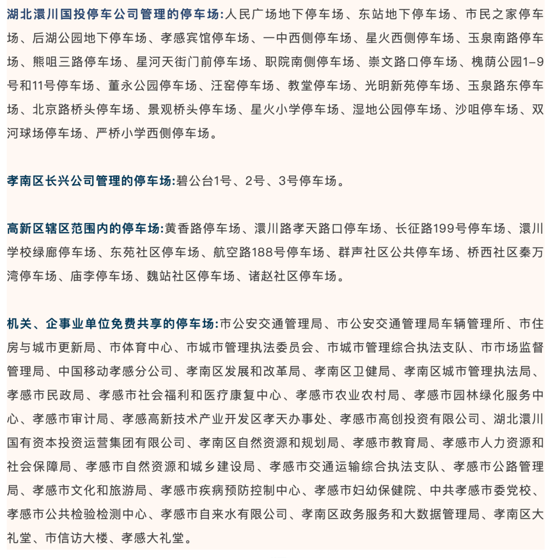 开放范围涵盖多类停车设施,包括湖北澴川国投停车公司管理的人民广场地下停车场、东站地下停车场等24处;孝南区长兴公司管理的碧公台1号、2号、3号停车场;高新区辖区的黄香路停车场、澴川路孝天路口停车场等11处;以及市公安交通管理局、市住房与城市更新局、市体育中心等30余家机关、企事业单位院内停车场。