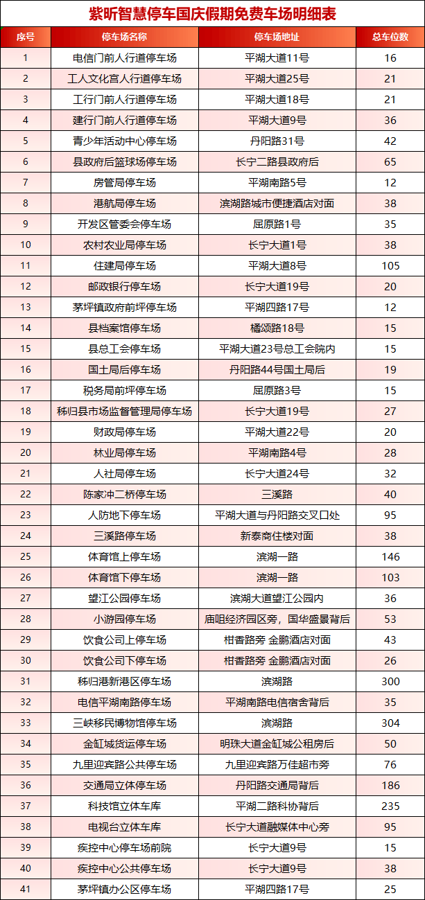 9月30日至10月8日,县城区机关企事业单位内部停车场全部免费开放,方便游客畅游竹溪。