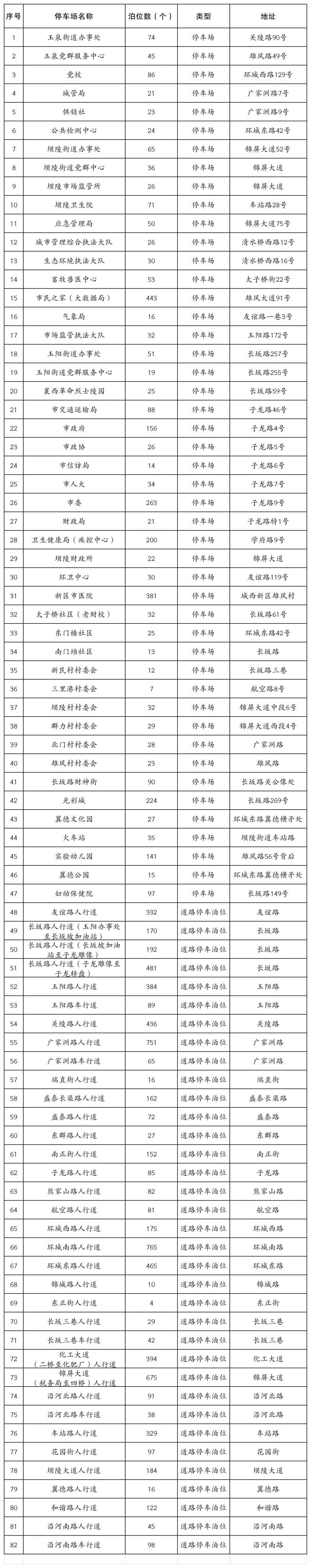 中心城区范围内所有机关(事业)单位院内停车位8324个(涉及保密、安全或特殊物资管理的单位除外)。中心城区部分停车场以及道路收费停车位8282个。临时免费停车位1.3万个。总计近3万个。