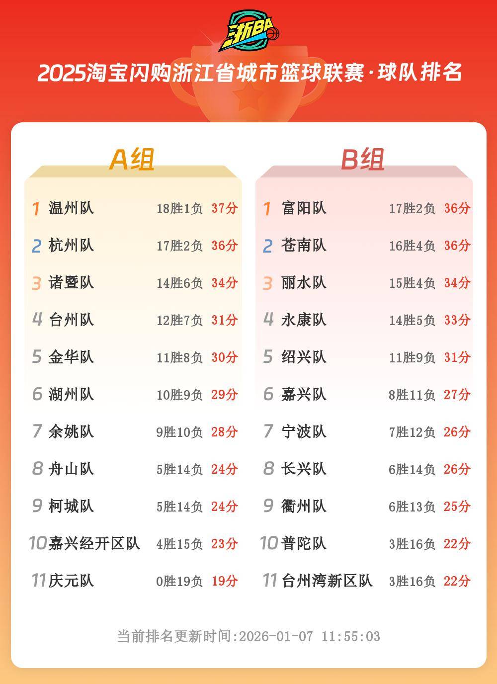 2026-01-10CBA,中国男子篮球职业联赛,CBA赛程,CBA直播,CBA比分,CBA投注/提供CBA最新赛程、实时比分、球队阵容、球员数据及盘口分析,服务中文球迷与篮球数据爱好者,让你全面掌握CBA最新动态。2025年浙江省城市篮球联赛(简称“浙BA”)作为浙江省规模最大、档次最高的群众篮球赛事,覆盖全省11个地级市及90个县(市、区),自启动以来便受到了广泛的关注和支持。“浙BA”城市争霸赛阶段八强比赛即将拉开帷幕,目前,