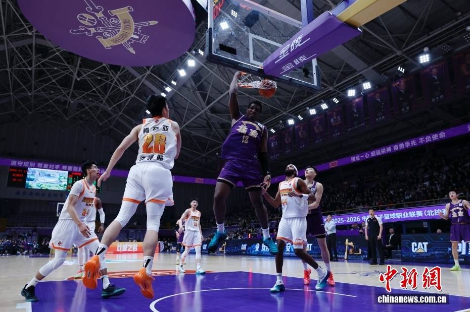 1月15日,在北京奥体中心体育馆举行的2025-2026中国男子篮球职业联赛(CBA)常规赛比赛中,北京控股队主场100比105负于江苏肯帝亚队。图为北京控股队球员佩里(紫衣)在比赛中扣篮。中新社记者 韩海丹 摄