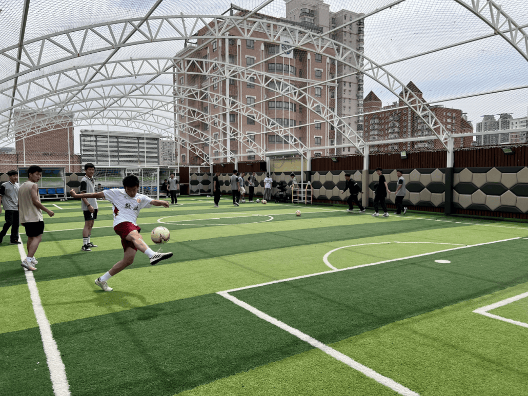 让王宏华非常感慨的是,之前上体育课,因为没有专业的足球场地,只能在篮球场的一角,放上一个移动球门,“后来,我们也是应学生的要求,挖掘了楼顶的空间,修建了屋顶足球场。”