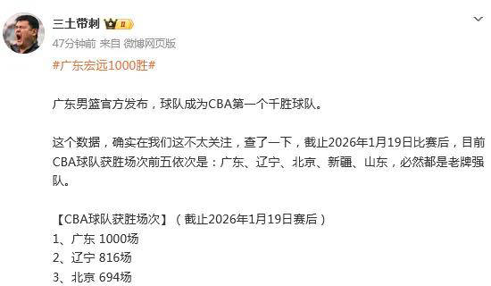 2026-01-22CBA,中国男子篮球职业联赛,CBA赛程,CBA直播,CBA比分,CBA投注/提供CBA最新赛程、实时比分、球队阵容、球员数据及盘口分析,服务中文球迷与篮球数据爱好者,让你全面掌握CBA最新动态。北京时间2026年1月19日,CBA常规赛继续激情上演,广东宏远男篮以104-76大胜四川队,这场比赛不仅是一场胜利,更标志着广东宏远篮球俱乐部在职业联赛历史上迎来了第1000场比赛的辉煌胜利!作为CBA历史上首个达到这一荣耀的俱乐部,这1000胜不仅是数据的累积,更是数代宏远球员用汗水和拼搏书写的一段王朝传奇。