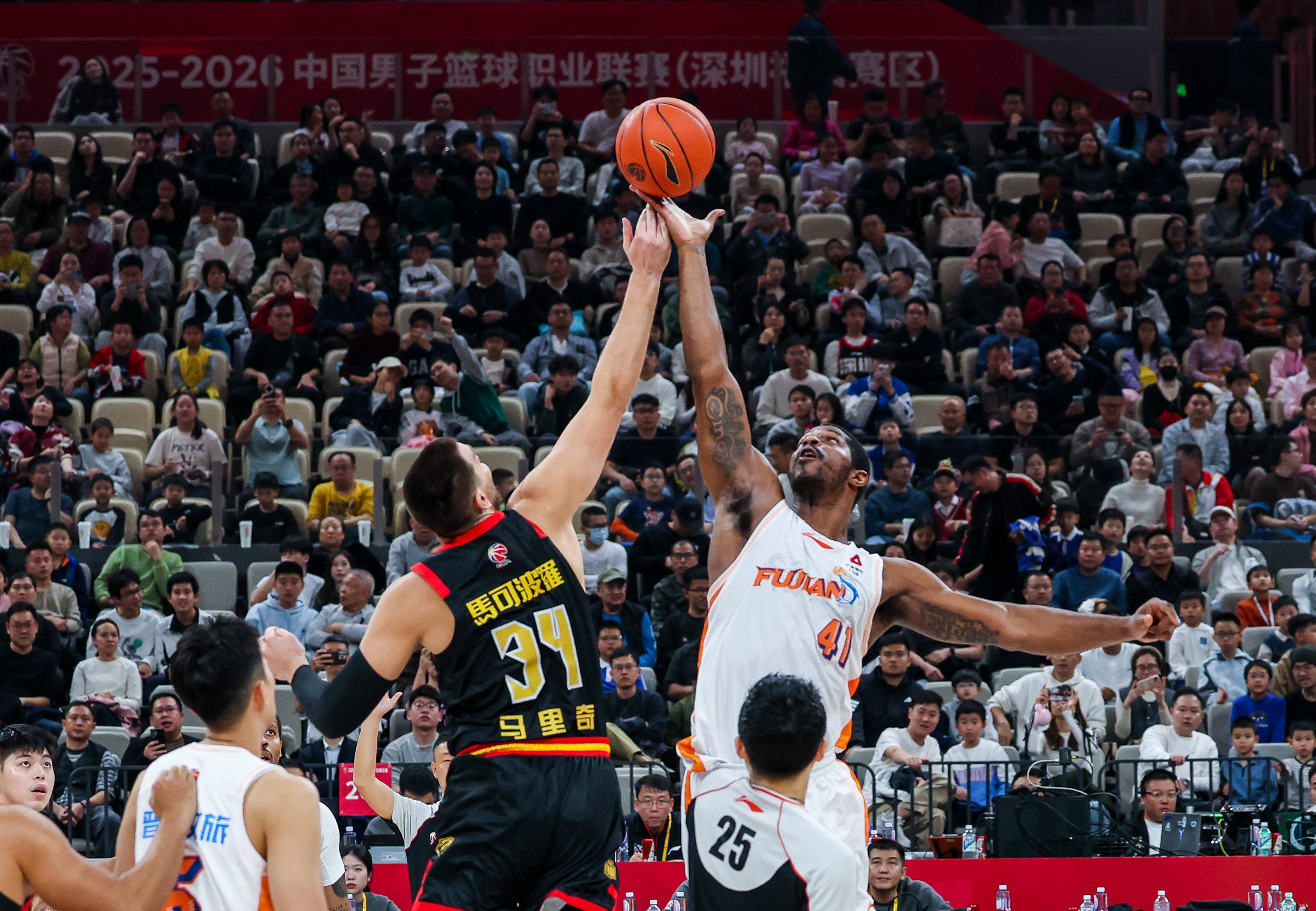 1月27日,福建晋江文旅队球员威廉姆斯(上右)与深圳马可波罗队球员马里奇(上左)在比赛中跳球。 新华社发(彭志刚摄)
