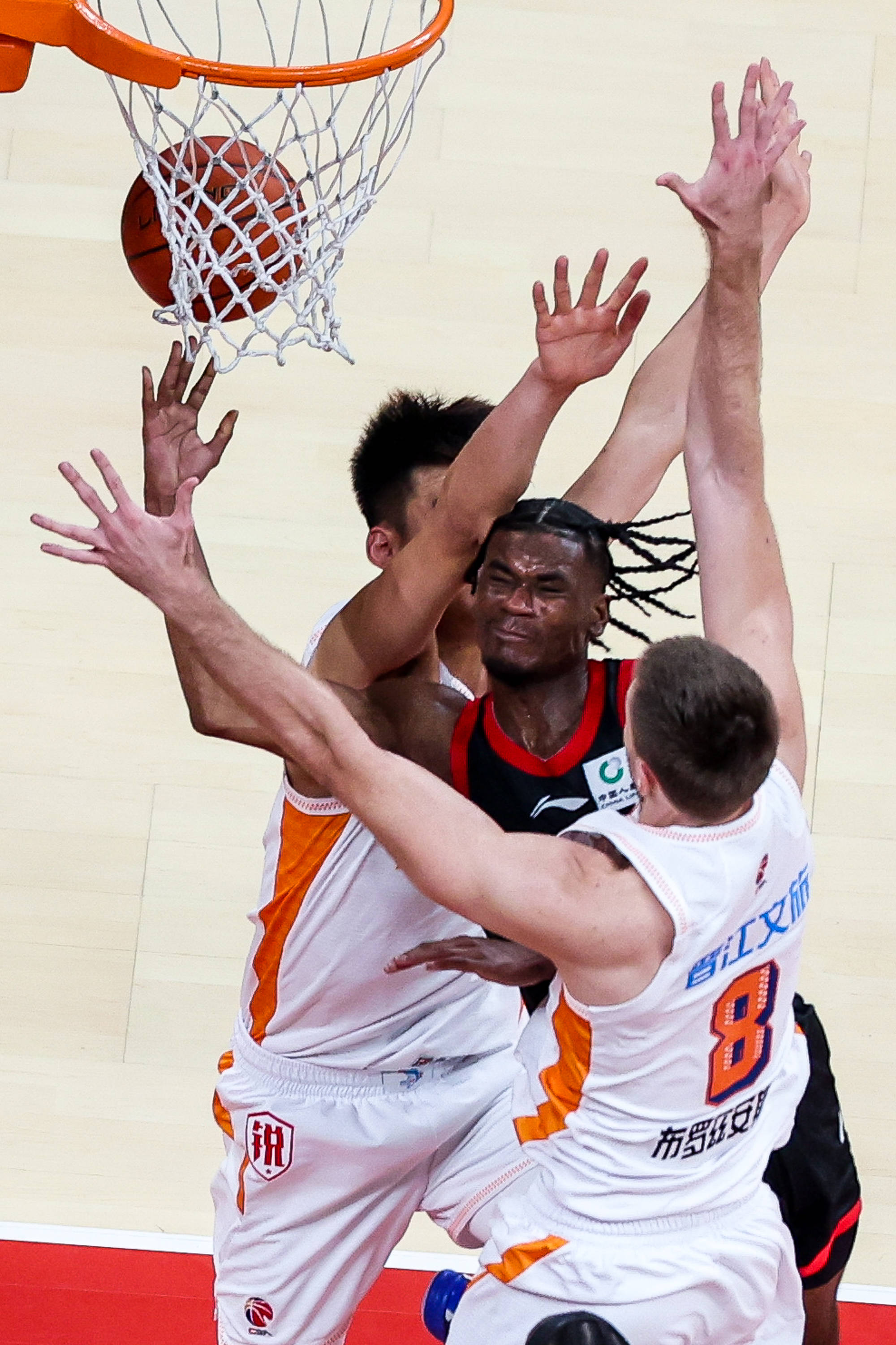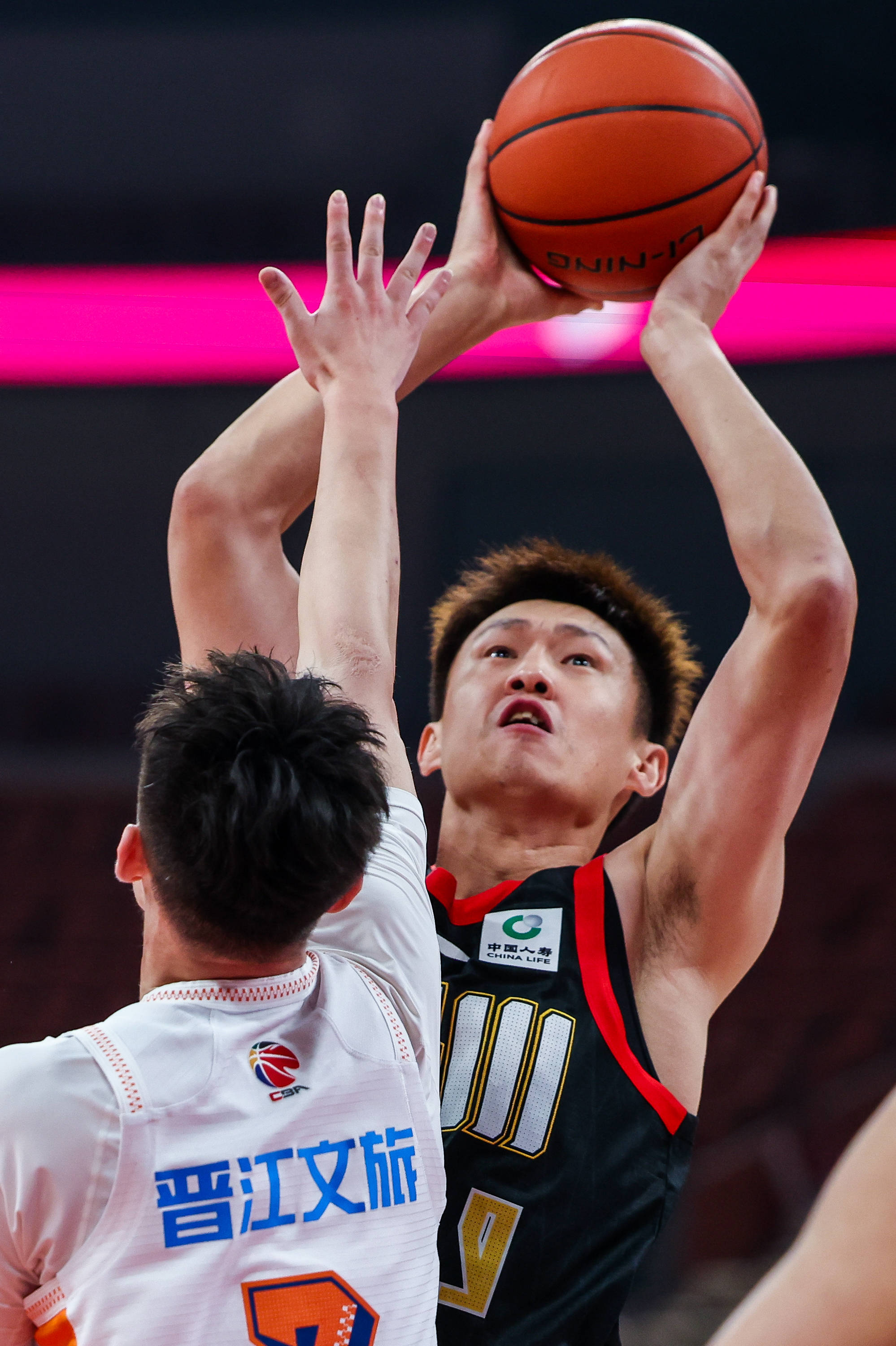 1月27日,福建晋江文旅队球员威廉姆斯(上右)在比赛中拼抢篮板。 新华社发(彭志刚摄)
