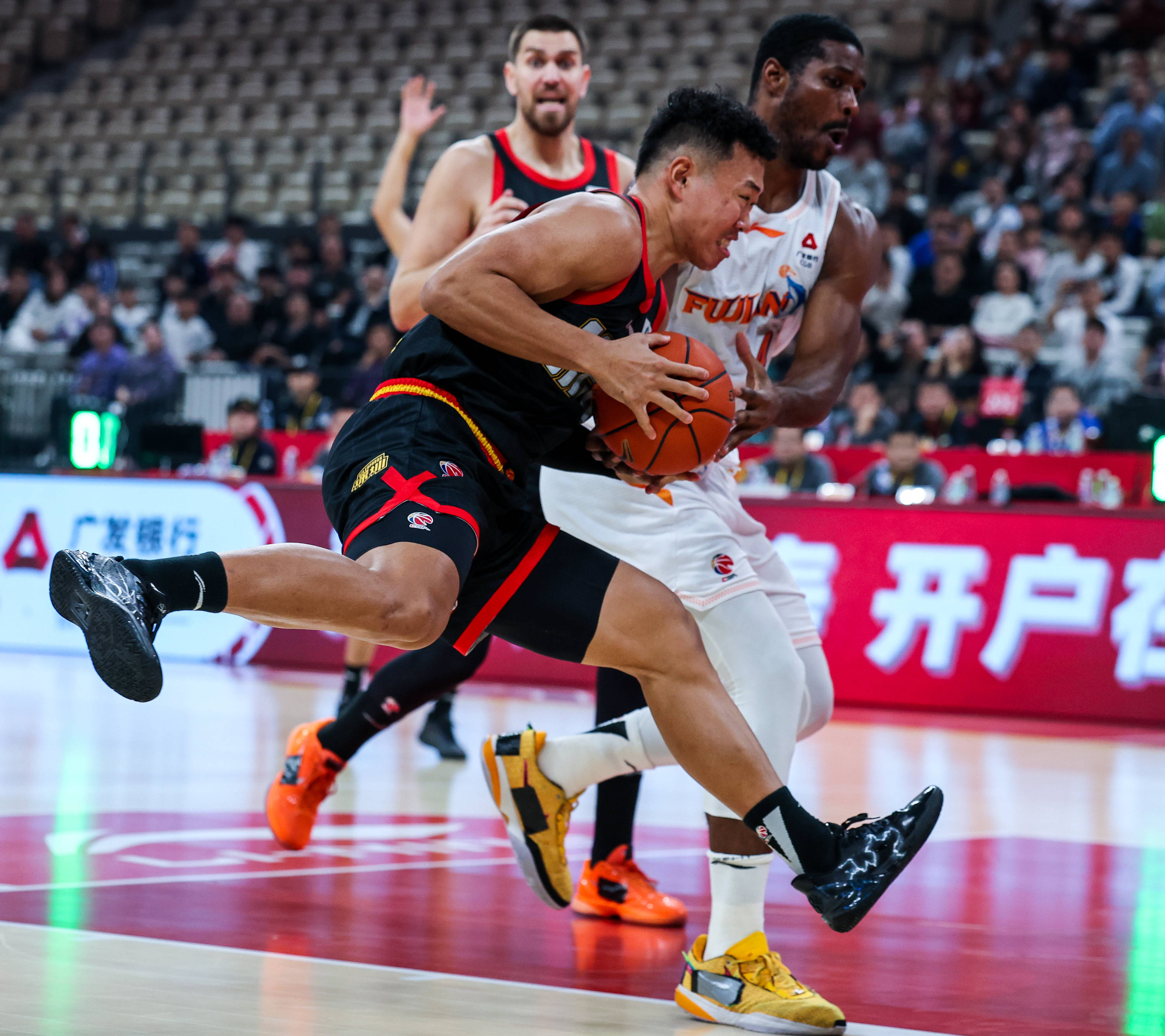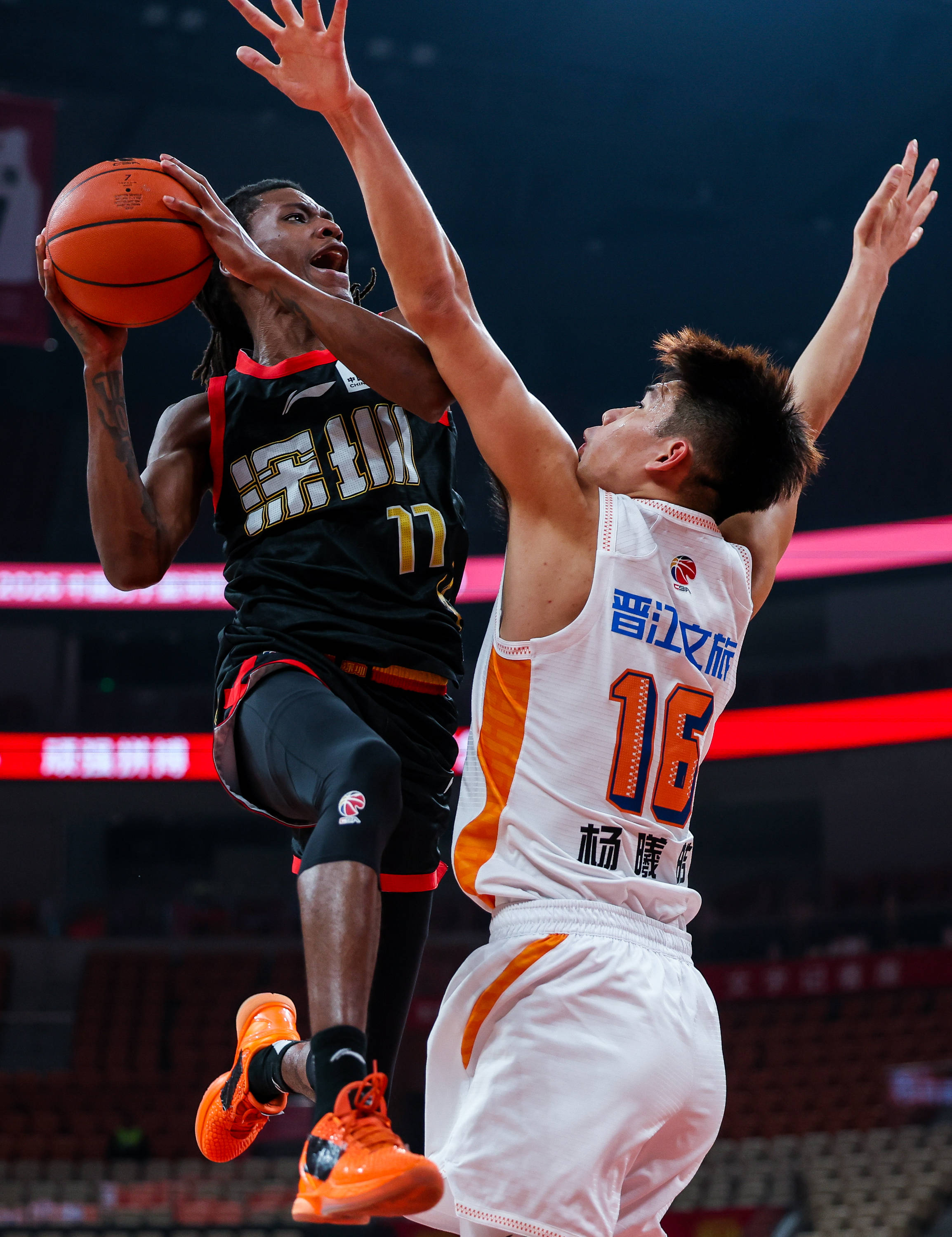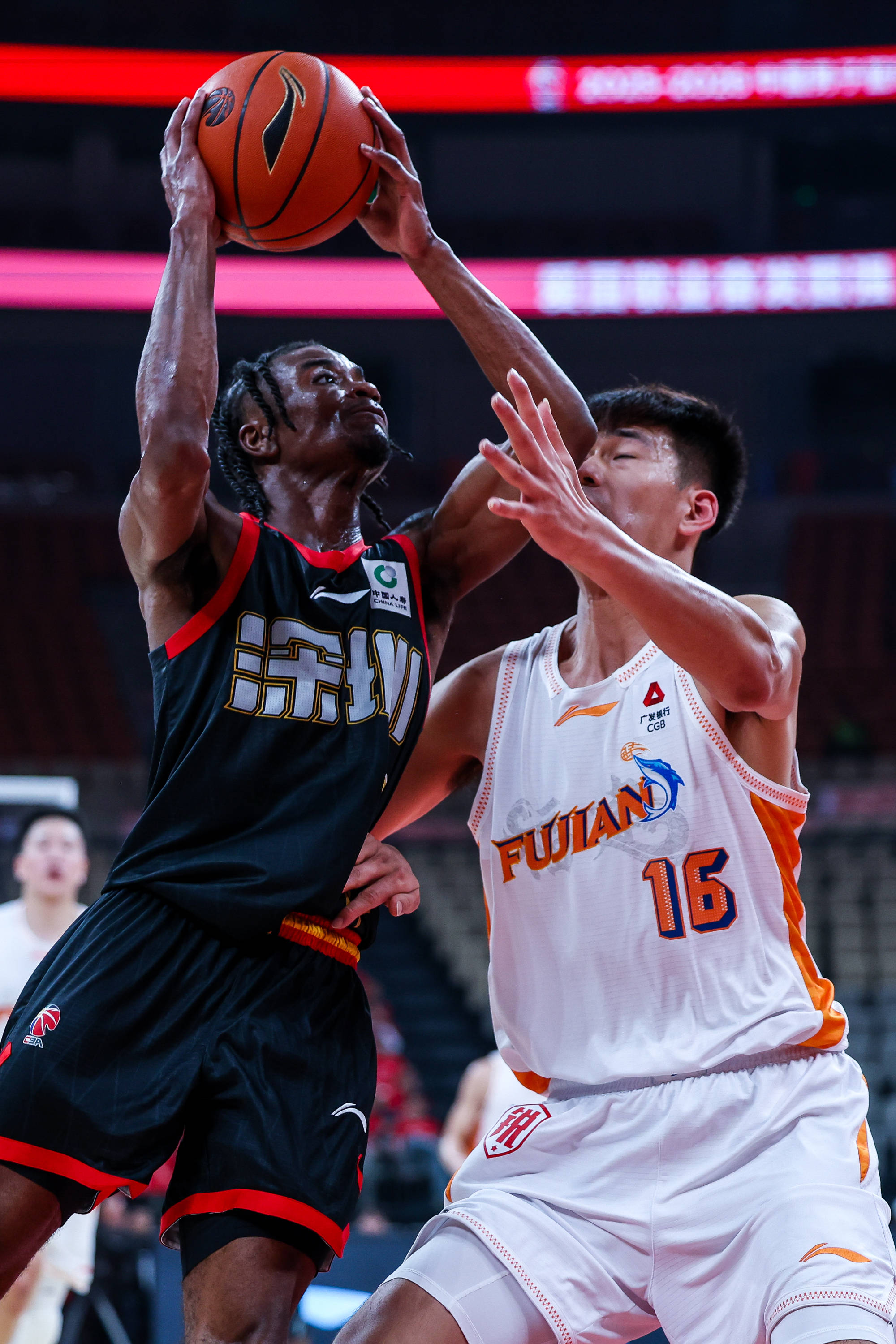 1月27日,深圳马可波罗队球员贺希宁(左)在比赛中与福建晋江文旅队球员特莱斯拼抢。 新华社发(彭志刚摄)