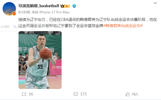 在CBA联赛报名截止日前,辽宁男篮前队长韩德君做出从CBA联赛退役的决定,不过对于是否参加全运会正赛,韩德君并没有给出明确答复,近日,据知名篮球媒体人导演我躺哪透露,经辽宁体育局邀请,韩德君已决定复出驰援参加全运会的辽宁男篮,并与前队友郭艾伦一块在辽宁体育馆里开启恢复训练。