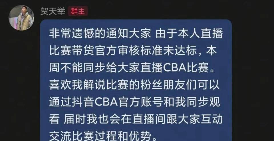 2025-12-27CBA,中国男子篮球职业联赛,CBA赛程,CBA直播,CBA比分,CBA投注/提供CBA最新赛程、实时比分、球队阵容、球员数据及盘口分析,服务中文球迷与篮球数据爱好者,让你全面掌握CBA最新动态。北京时间2025年12月22日,前辽宁篮球运动员贺天举在其粉丝群聊中透露,由于其近期直播带货的销售业绩未能达到平台设定的标准,因此本周将暂停同步直播CBA比赛。这一消息迅速在社交媒体和体育圈引发热议,成为抖音作为CBA官方合作伙伴后,首个因为带货数据不理想而暂时停止直播资格的主播案例。