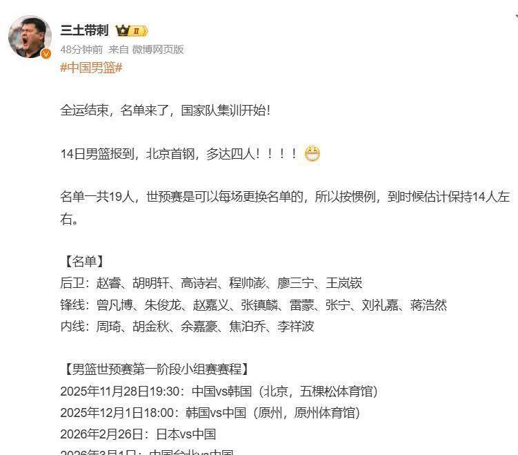 2025-11-15CBA,中国男子篮球职业联赛,CBA赛程,CBA直播,CBA比分,CBA投注/提供CBA最新赛程、实时比分、球队阵容、球员数据及盘口分析,服务中文球迷与篮球数据爱好者,让你全面掌握CBA最新动态。备战2027年世界杯的征程,中国男篮正式拉开序幕。为了即将到来的世界杯预选赛,中国男篮于2025年11月13日公布了一份备受瞩目的19人集训名单,瞬间引爆了篮球圈的讨论热潮。